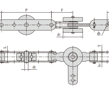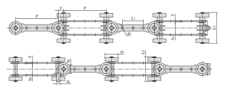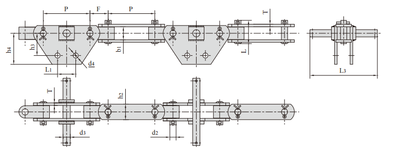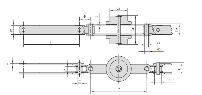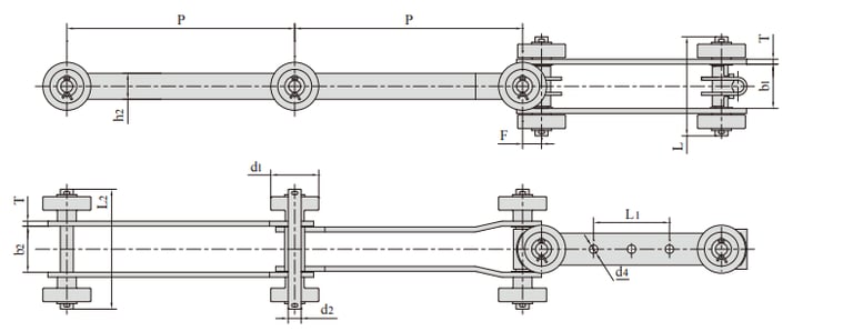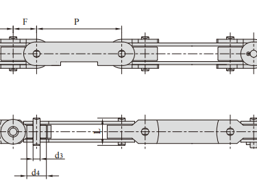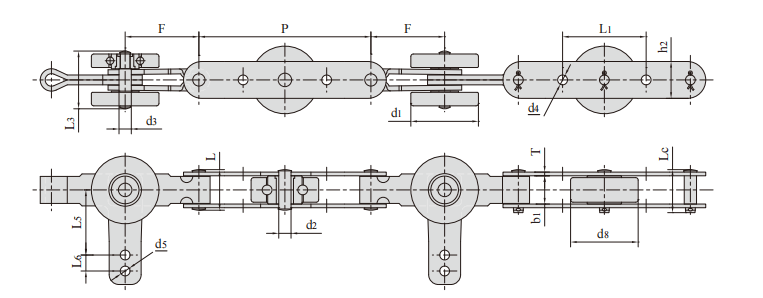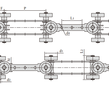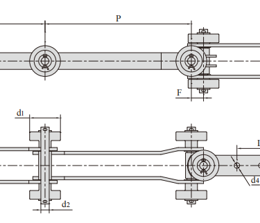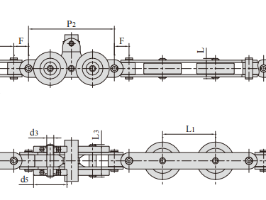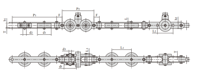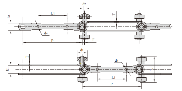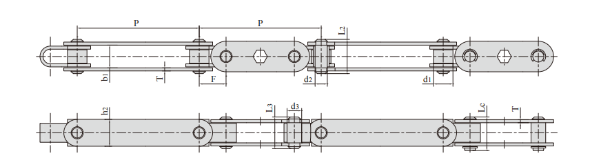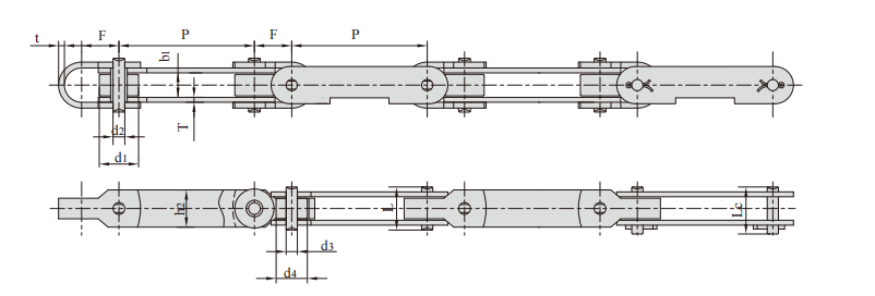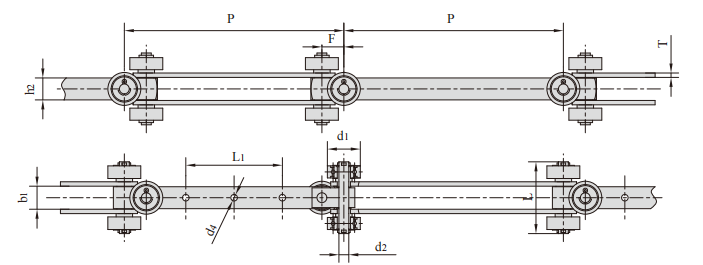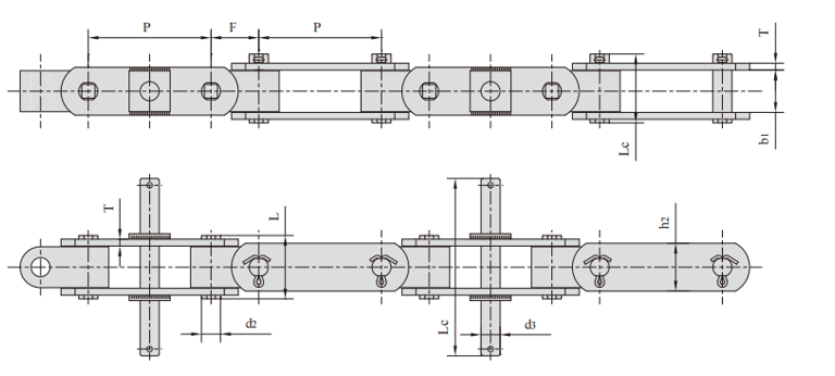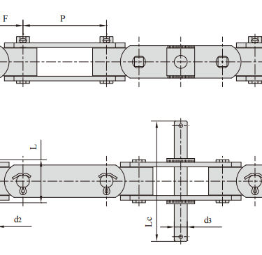 There are many structures of double hinged conveyor chain. Typical structures in JB/T8546 standard include A-type structure (double-chain plate with double sprockets and single guide sprocket), S-type structure (double-chain plate with double sprockets and double guide sprocket) and Q-type structure (light double-chain plate with double sprockets and double guide sprocket), which can realize correct positioning in the track and reduce running resistance.