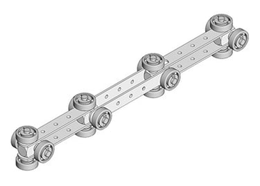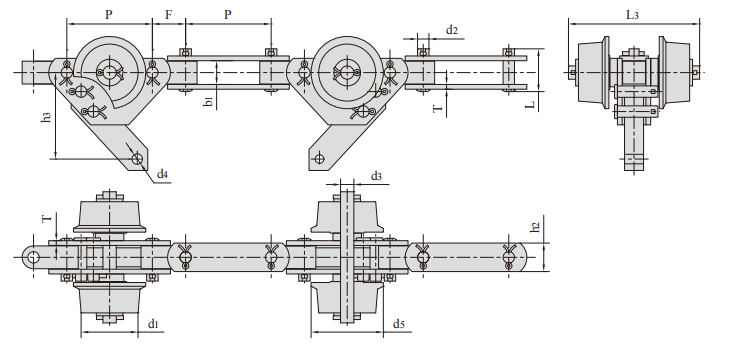 Double hinged conveying chain is the main traction component of light closed track suspension conveyor, which has two sets of hinges perpendicular to each other, and can run smoothly along curved closed track in space to realize suspension conveying.