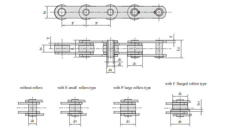 M-type is solid pin conveyor chain, MC-type is hollow pin conveyor chain, MT-type is large roller heightening chain plate conveyor chain, and MC-type and MT-type chain shave two kinds of products with tensile strength indexes for users to choose from.